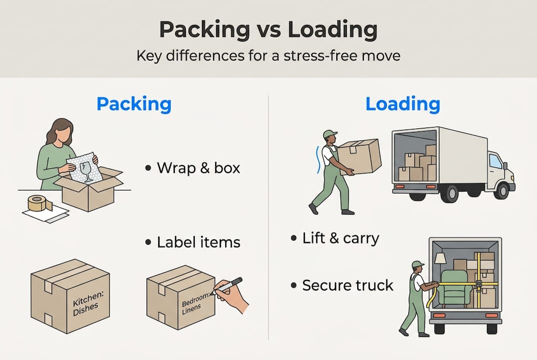 | What it involves | Wrapping, boxing, labeling items | Placing items into the truck safely |